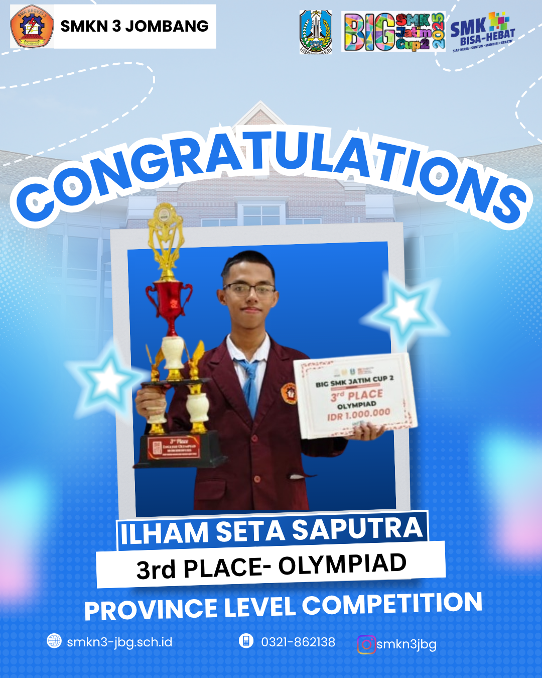 Dalam kesempatan tersebut, SMK Negeri 3 Jombang berhasil menorehkan prestasi membanggakan dengan meraih Juara 3. Pencapaian ini diraih oleh Ilham Seta Putra, siswa kelas XI-TEI, yang dikenal rajin, tekun, serta memiliki ketertarikan besar dalam bidang bahasa Inggris. Pada kompetisi ini, Ilham berhasil meraih skor total 192, sebuah pencapaian yang menunjukkan konsistensi dan kemampuan luar biasa dalam berkompetisi.