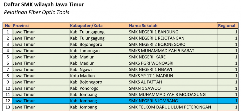 Berikut ini adalah daftar SMK yang mengikuti pelatihan penggunaan peralatan fiber optik di SMK Negeri 3 Jombang: